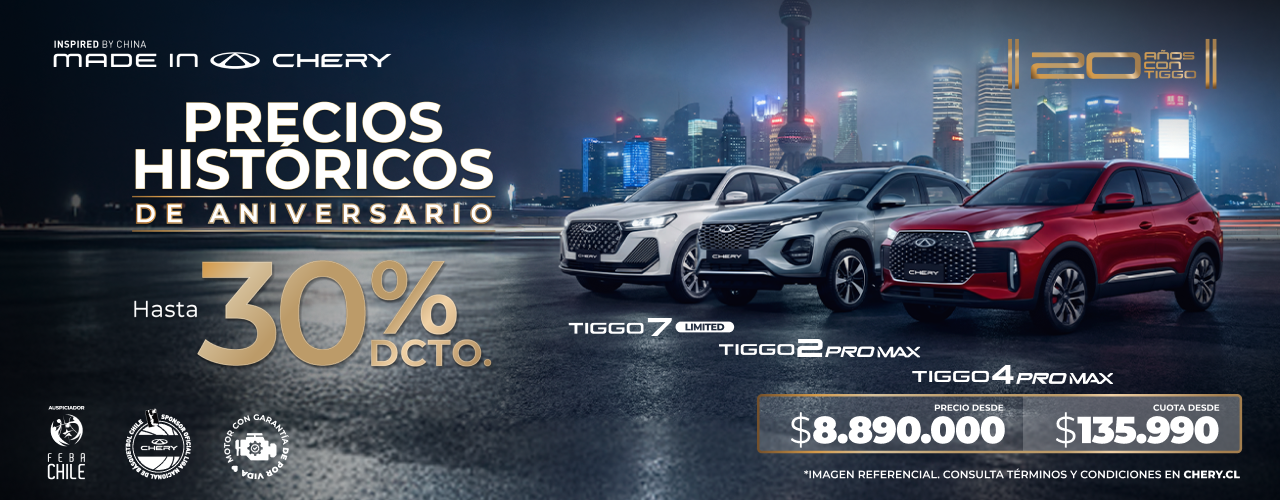 Promoción válida por compras realizadas entre el 01 y el 31 de marzo de 2026 y financiadas mediante crédito otorgado por Santander Consumer Finance Ltda. La aprobación, condiciones y otorgamiento del financiamiento están sujetos a la evaluación comercial conforme a las políticas de Santander Consumer Finance Ltda. Valor cuota corresponde a Chery Modelo TIGGO 2 PRO MAX 1.5. Precio sin bono: $12.990.000. Precio $8.890.000 incluye bono con financiamiento Santander Consumer, bono marca y bono online de $4.100.000. Condiciones de Financiamiento: Pie máximo 50% y plazo 37 meses, con producto Compra Inteligente Santander Consumer, línea Prime, VFMG (Cuota 37) de 30% del valor del vehículo. Ejemplo Simulación: Modelo TIGGO 2 PRO MAX 1.5. Precio con bono $8.890.000, Pie $4.44.000, CAE 28,1%, CTC de $ 7.562.640, 36 cuotas de $135.990 más VFMG (Cuota 37) de $ 2.667.000 . Valores no incluyen seguros, los seguros son optativos. La disponibilidad y proceso de compra de vehículos son de exclusiva responsabilidad de la marca y su red de concesionarios, no cabiéndole a Santander Consumer Finance Ltda. intervención alguna en ello ni en la ulterior responsabilidad que ello pudiere generar. Para más información sobre condiciones de otorgamiento, ingrese a www.santanderconsumer.cl. Infórmese de la garantía estatal de los depósitos en su banco o en www.cmfchile.cl